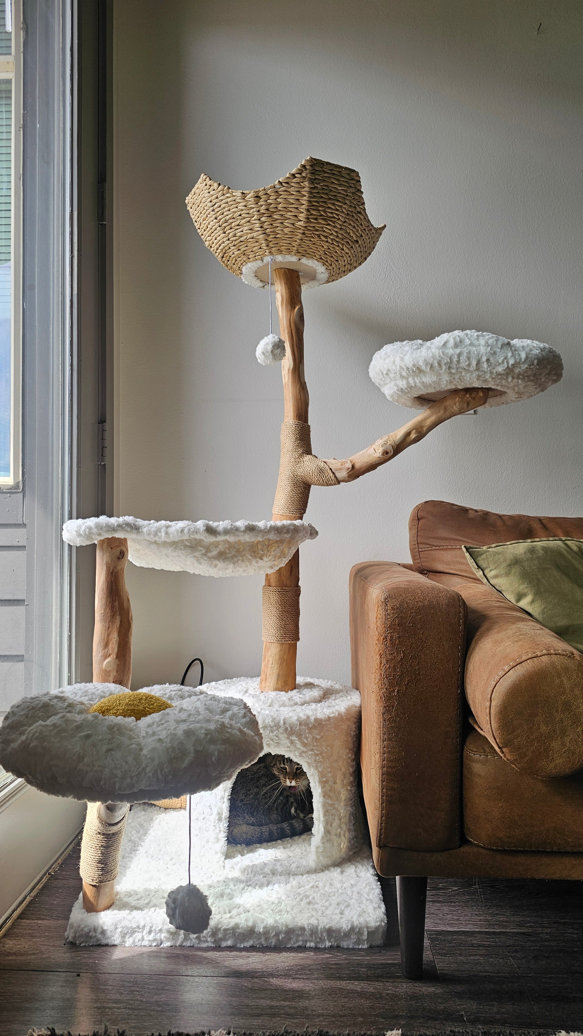 Meet the Nimbus Luxury Rattan Cat Tower — a five-tier, furniture-grade cat tree handcrafted for homes that crave beauty and feline function. Made with real pear wood branches, ultra-soft cloud fleece, and a handwoven rattan nest bed, this is not your average cat tree. It’s a statement piece — for both your cat and your space.