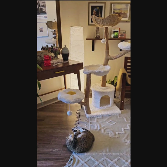 Meet the Nimbus Luxury Rattan Cat Tower — a five-tier, furniture-grade cat tree handcrafted for homes that crave beauty and feline function. Made with real pear wood branches, ultra-soft cloud fleece, and a handwoven rattan nest bed, this is not your average cat tree. It’s a statement piece — for both your cat and your space.
