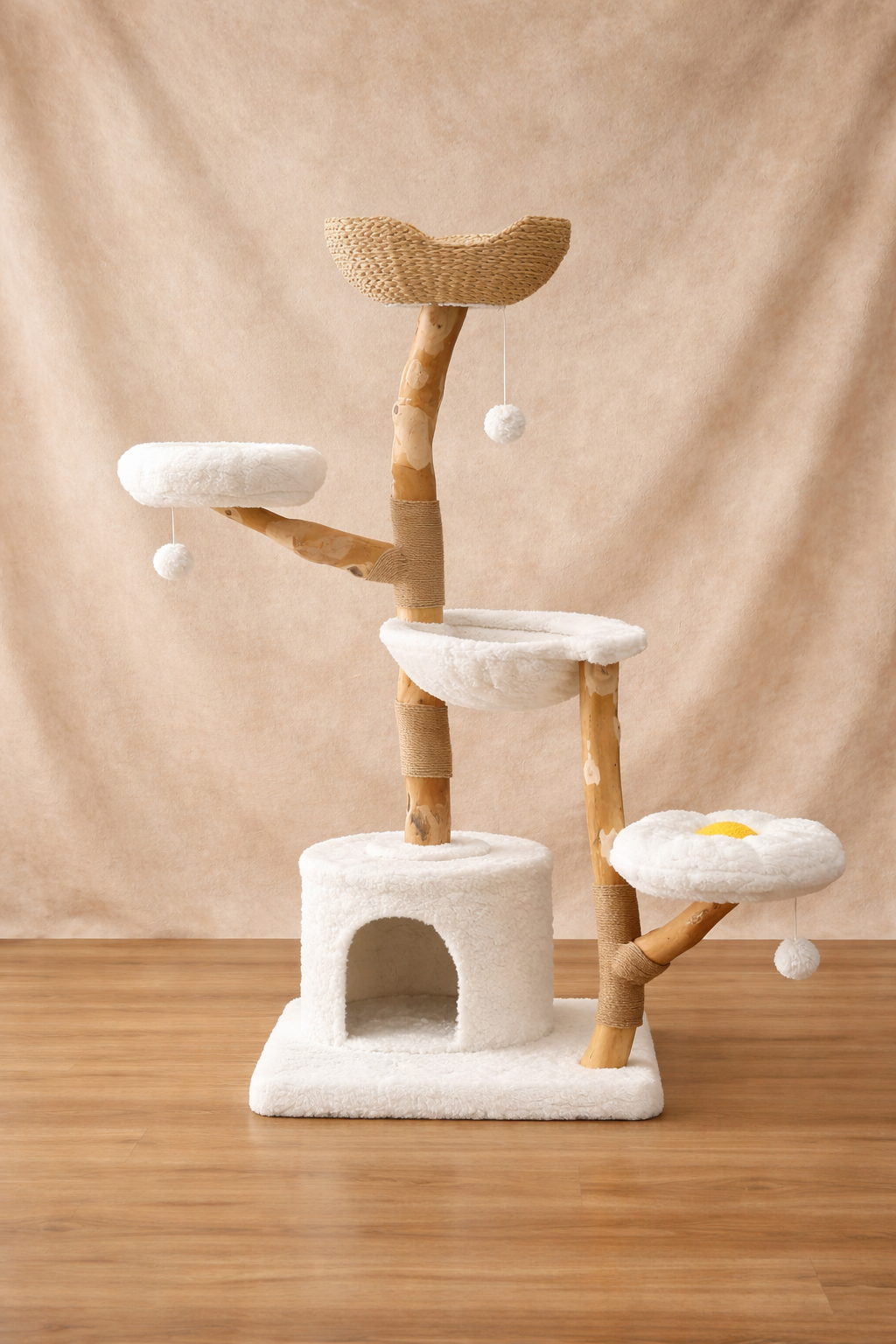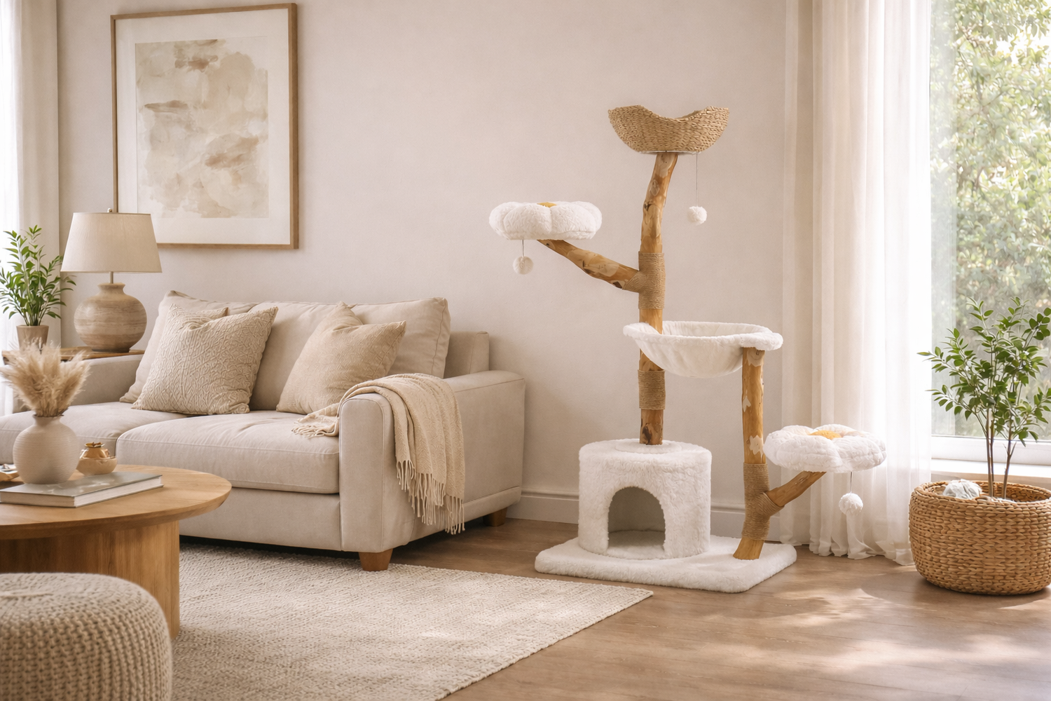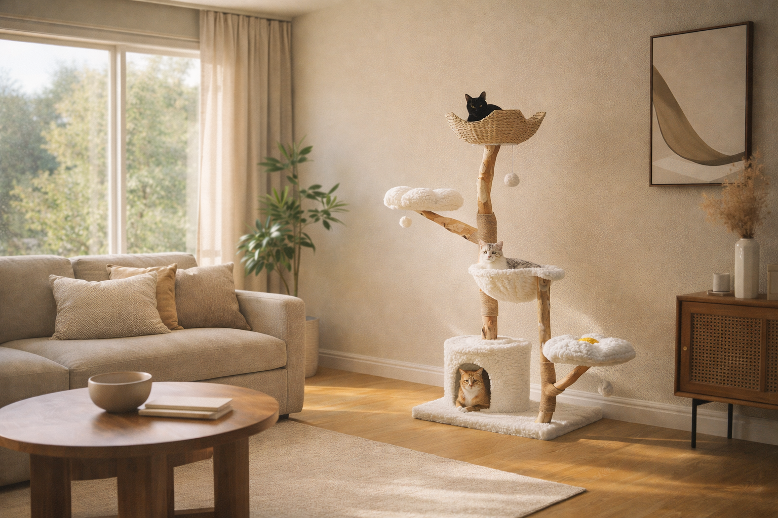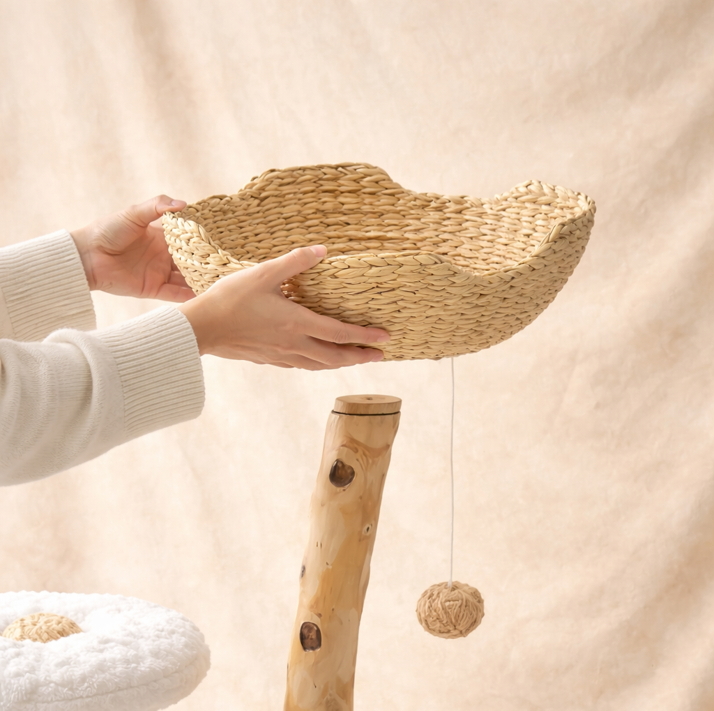 Nimbus Plus is a five-tier, furniture-grade cat tower designed for larger cats and multi-cat homes. Built with natural pear wood branches, hand-woven rattan baskets, and ultra-soft cloud fleece, it offers vertical freedom, stability, and comfort—without compromising the aesthetic of the home.