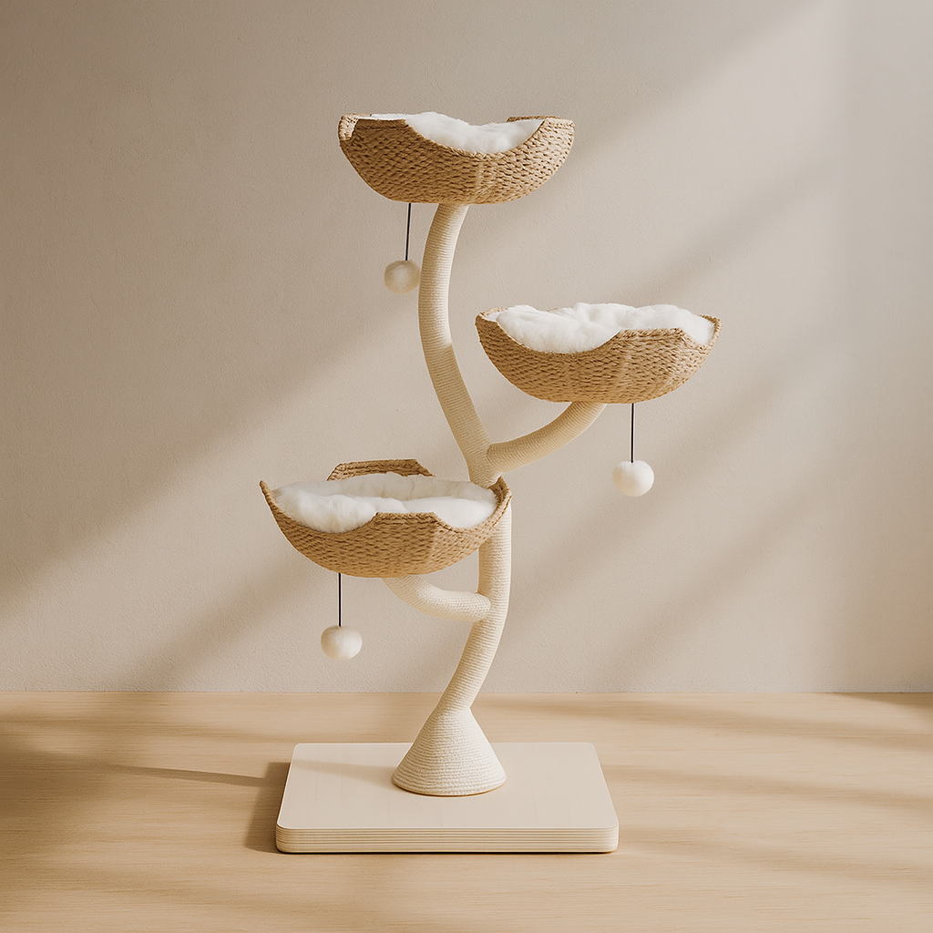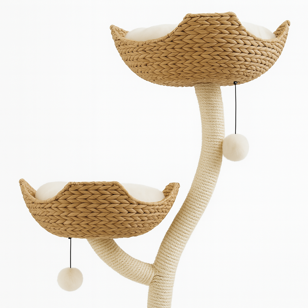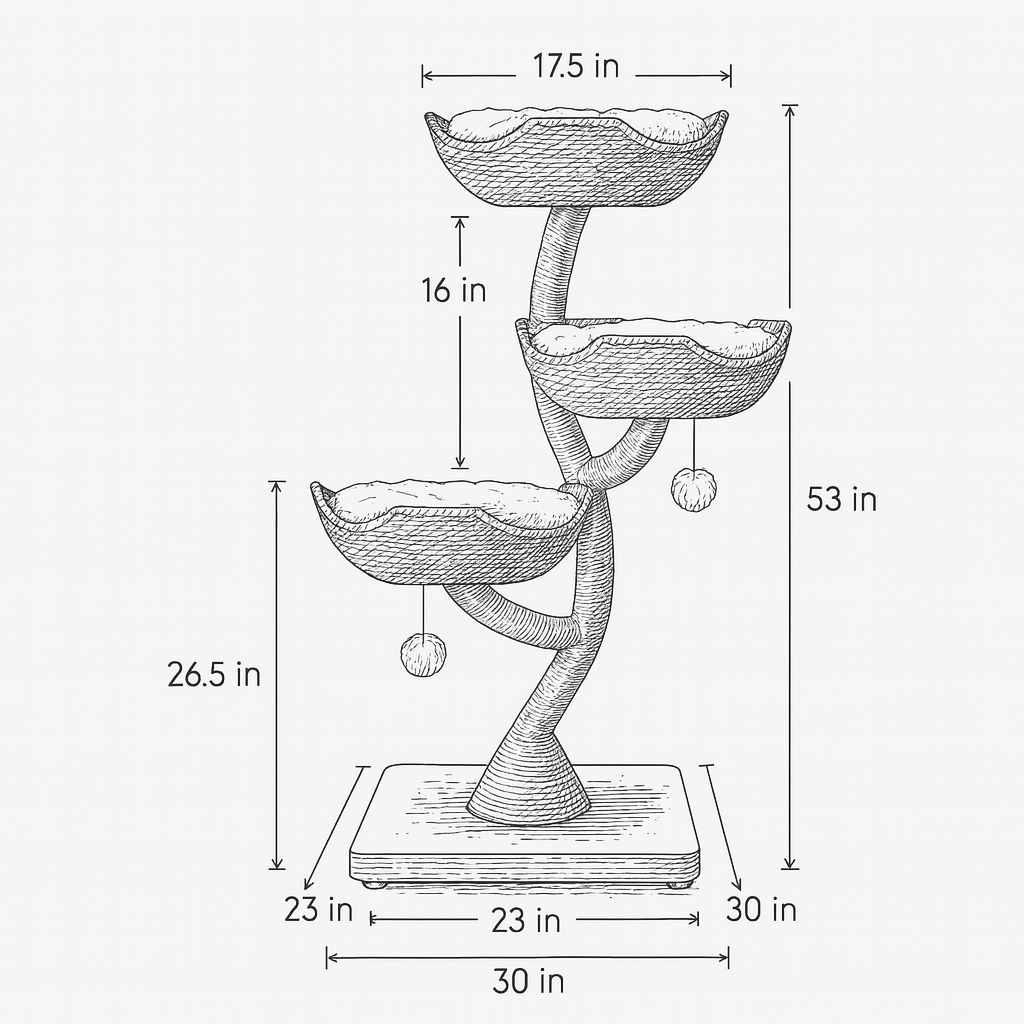 Three airy baskets cradle removable faux-shearling cushions, so every nap feels like cloud-gazing in a sun-drenched treetop. A heavy 23-inch birch plywood base and a 2-inch galvanized steel core keep even the most athletic jumpers stable. Finished with replaceable sisal bark and dangling plush pom-poms, WillowWhisper™ channels natural enrichment while protecting your furniture from enthusiastic claws.